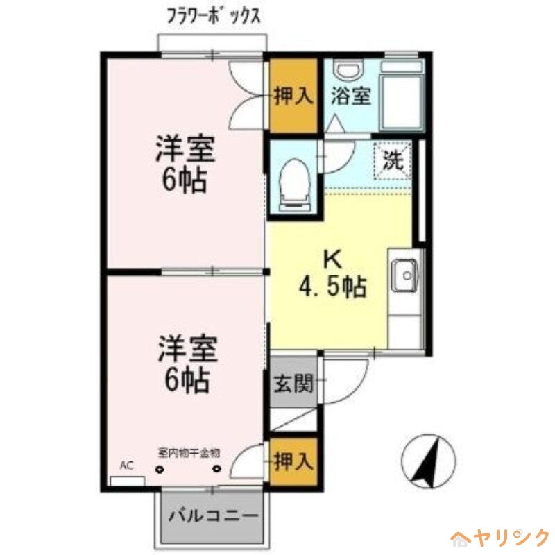 オール洋室の2K。 モニターホンやエアコン、シャワートイレ、居室照明などの設置あり。