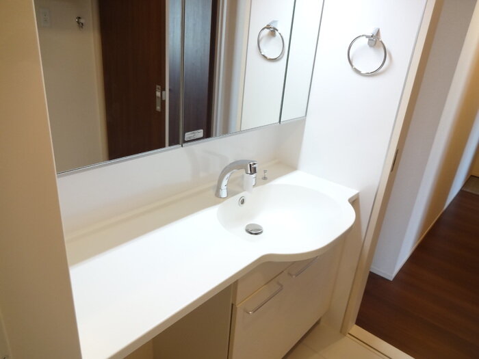 振り分けタイプの間取りなのでプライベートも保てます。 ワイド洗面台付き。コンセントも多く、ちょっとした椅子も置けるのでドレッサーとしても使える多機能な洗面台です!