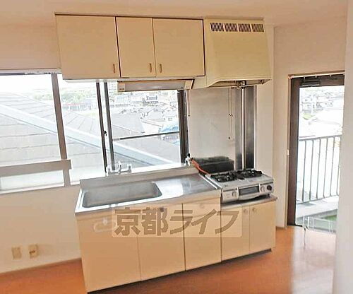 窓に面した明るいキッチンスペースです