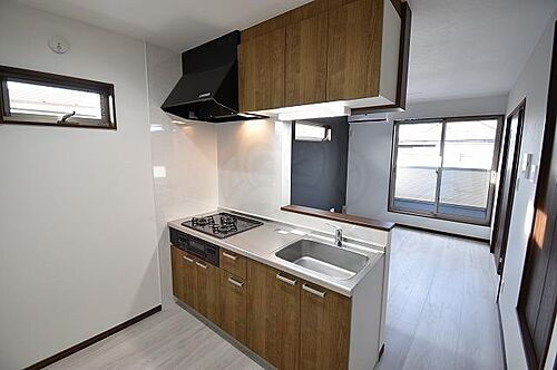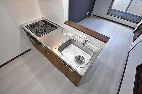 戸建て感覚のテラスハウスです。キッチンはカウンターキッチンになっており、3口のガスコンロ付きです。