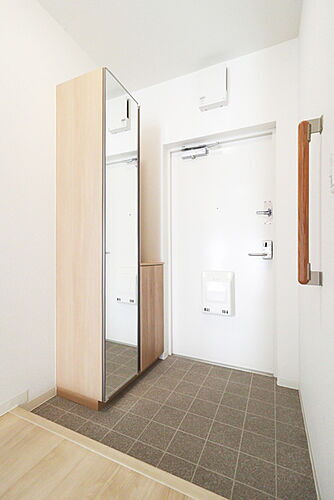 鏡付きのシューズボックスが設置された玄関