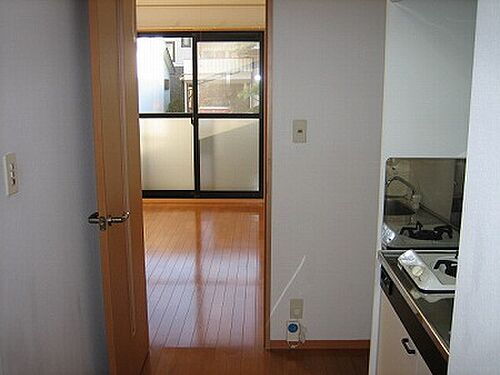 玄関入って、右側にキッチンと正面に8帖のフローリングの洋室が見えます。