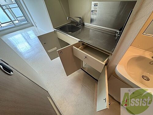 キッチン下の棚に台所用品や食器などを入れることができます