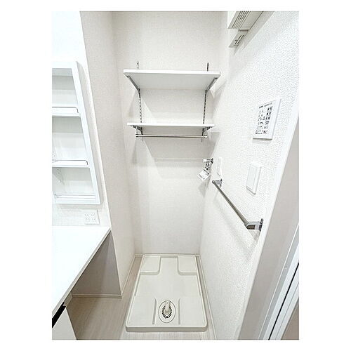 洗濯機置き場・上部に便利な収納棚付き