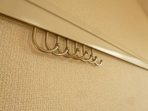 洋室の壁には【レールフック】が7個有り、ハンガーを始め時計やお気に入りの絵画など飾れます。レールの上にもハンガーが掛けられます。お気に入りのシャツを掛けたり【見せる収納】です。