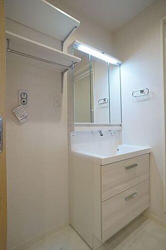 ☆洗面化粧台は三面鏡タイプ、洗濯機置き場の上部には『ランドリー収納棚』をご用意しました☆