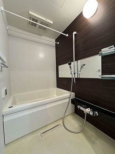 【浴室】沸し直しができ経済的な追焚機能付きの浴室は、ダーク系のアクセント壁がモダンな印象を演出してくれます♪