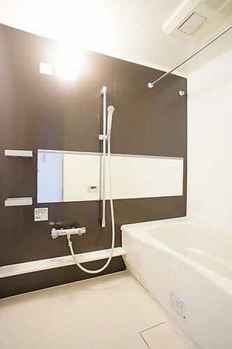【浴室】沸し直しができ経済的な追焚機能だけでなく、衣類乾燥や冬に浴室内を暖めてから入浴が出来る暖房機能も付いています♪ダーク系のアクセント壁がモダンな印象の浴室は、あなたを癒すリラックス空間♪