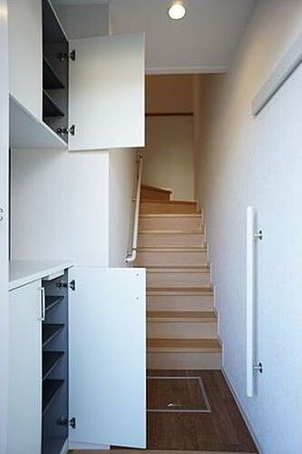 ■玄関■シューズBOXは上下二段に分かれていて収納力も◎!カウンター部分を利用して小物を飾れます♪