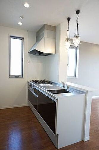 ■キッチン■3口ガスコンロのシステムキッチン!お料理の効率も上がりますね♪対面キッチンなので、会話を楽しみながらお料理もできます♪