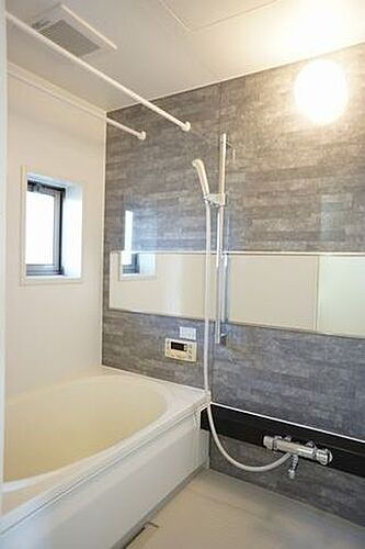 ■浴室■1日の疲れを取るお風呂は壁の一面だけ色を変えてアクセントを付けています。沸かし直しができて便利な追焚機能付き☆温度調節可能なサーモスタット水栓♪シャワーとカランの切替も楽ちんです☆