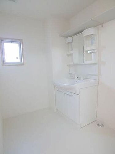 洗面台は洗髪のできる【シャンプードレッサー】です♪ハブラシ置きや小物を置ける棚も付いております♪洗面所の上部には棚も付いていますので、サニタリーグッズも置く事ができます♪