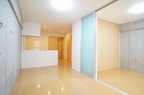 【LDK】リビングと洋室は透過性のあるスライディングスクリーンで仕切られ、写真の様に全開にすると広々とした開放的な空間となります♪