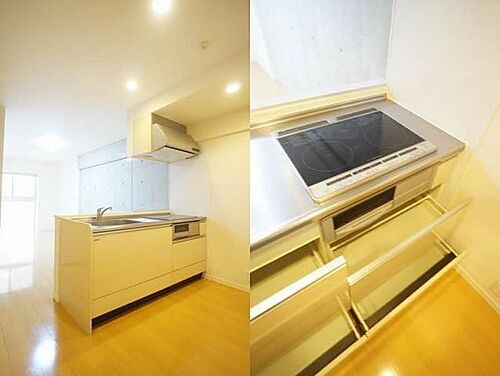 【カウンターキッチン】奥に入れた物も簡単に取り出せる『オールスライド収納』でたっぷり収納できるカウンターキッチンは、吊戸棚がなく開放的な空間も演出♪『IHクッキングヒーター(3口+グリル)』付♪