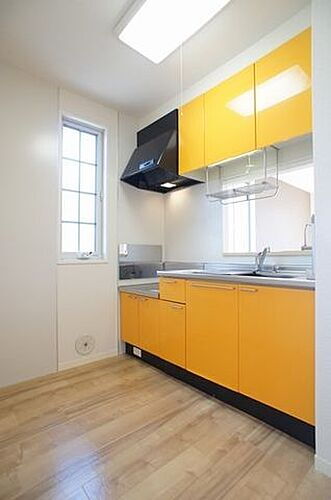 水きり台や作業台、布巾掛け等のカウンターとしても活用できる食洗器台を備えた機能的なキッチン♪ビビッドカラーのパネルが明るい雰囲気♪