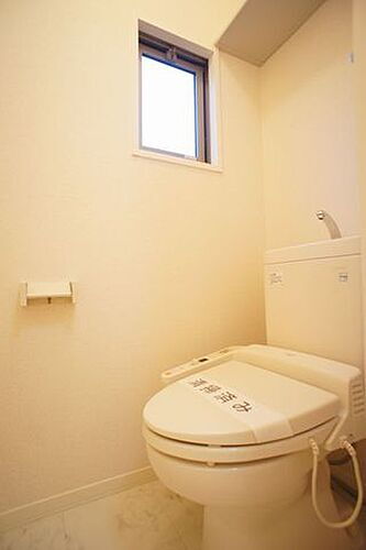 トイレ☆洗浄機能付便座が備え付け☆上部には収納棚が付いておりますので簡単なトイレ用品を収納できます☆小窓が付いております
