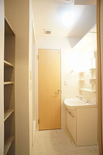 鏡の両脇に収納スペースを確保した洗髪洗面化粧台は、水洗がリフトアップするので洗髪もラクラク♪脱衣所入口脇には収納棚付き♪