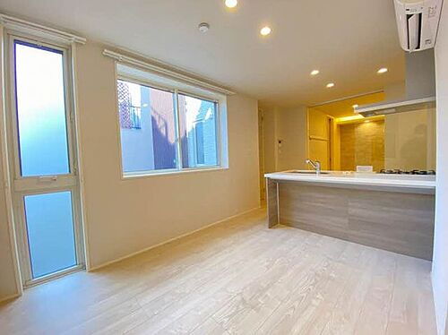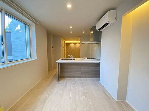 【 LDK 】 設え(カーテン、キッチン用品)はイメージとなります。エアコン付。照明、ダウンライトも付いています。