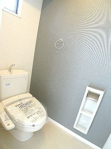【トイレ】トイレには洗浄機能付き便座を設置!!ツールボックスやタオル掛け、小窓を設置しております♪