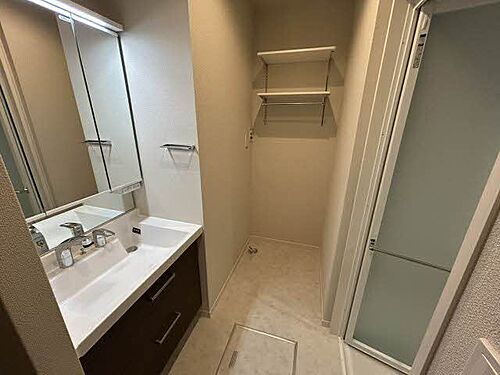 洗髪洗面化粧台は三面鏡収納。ドライヤーや化粧品など、必要なものがすっきりと収まり、毎日の生活にとても便利です。