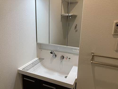 洗髪洗面化粧台は三面鏡収納。ドライヤーや化粧品など、必要なものがすっきりと収まり、毎日の生活にとても便利です。
