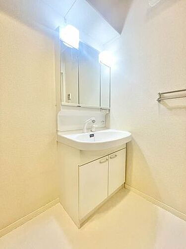 洗髪洗面化粧台は三面鏡収納。ドライヤーや化粧品など、必要なものがすっきりと収まり、毎日の生活にとても便利です。