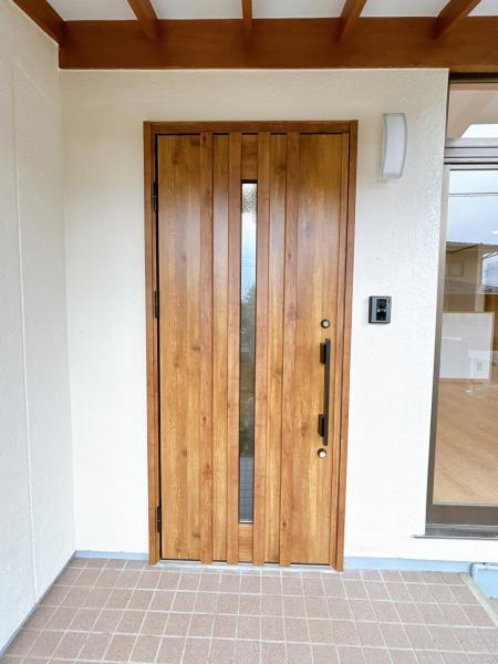 【リフォーム完了】玄関は開き戸タイプの玄関ドアに交換し、ドア周りはアクセントサイディング張りを行いました。土間は高圧洗浄で洗い出します。「いってきます」「ただいま」繰り返す日々が家族の歴史になっていき