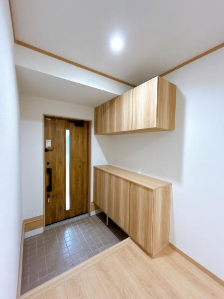 【リフォーム中】玄関ホールです。床は長尺シート、フローリングの上張り、天井のクロス張替、シューズボックス、照明は新品交換します。中古住宅だと昔のままといったイメージがありますが、新しく住まわれる方の事
