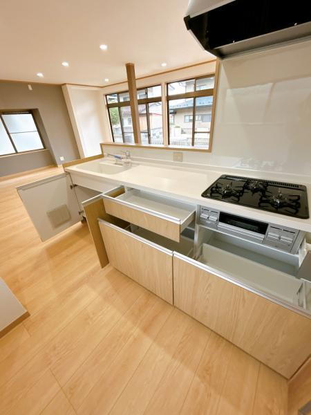 【リフォーム完了】キッチンは新品に交換しました。天板は人工大理石製なので、熱に強く傷つきにくいため毎日のお手入れが簡単です。