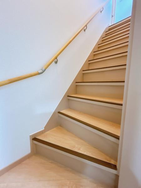 【リフォーム完了】階段は手すりを新品交換し、壁、天井はクロス張替を行いました。踏板はフローリング張りをし、蹴込は塗装し、ノンスリップを設置しています。クロスを張り替えることで暗くなりがちな階段スペース