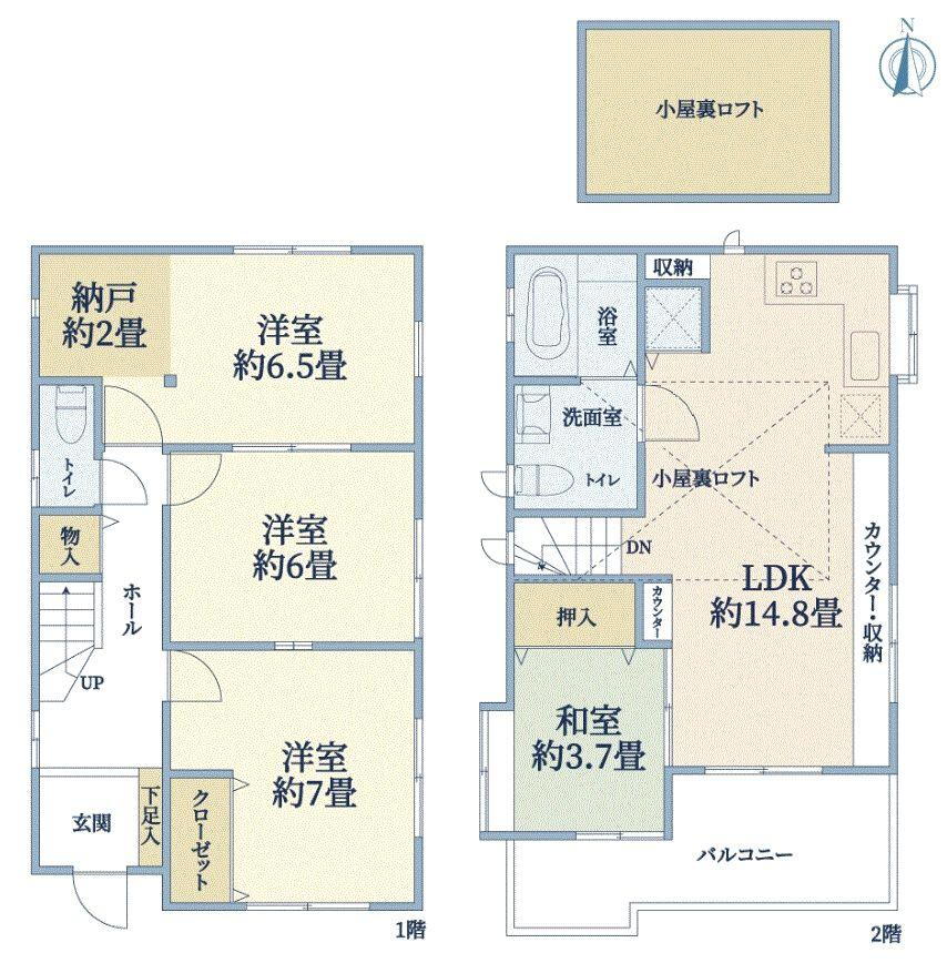 ┃▼周辺環境・立地環境┗━━━━━━━━━━━━━━━━━━━・物件周辺は街灯が多く歩道もあり、人通りの多い環境です。・路地状敷地のため、表通りから一本入っており、人目が気にならないのが特徴です。┃▼室内の特徴┗━━━━━━━━━━━━━━━━━━━・LDKは約14.8畳あり、カウンター収納には書類や小物類を仕舞うのに便利です。・各洋室は6畳以上確保しており、寝室やお子様のお部屋にお使いください。・採光・通気性に優れた2階に配置されたリビング。・リビング部分にロフトがあります。お子様のおもちゃや、季節外の家電製品・衣類等の収納に便利です。
