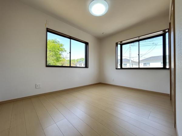 【リフォーム完成済み】2階南東側約6帖の洋室です。床はフローリング重張りを行い、壁・天井はクロスの貼り替えを行いました。南東側2面採光のお部屋でとても日当たり良好です。
