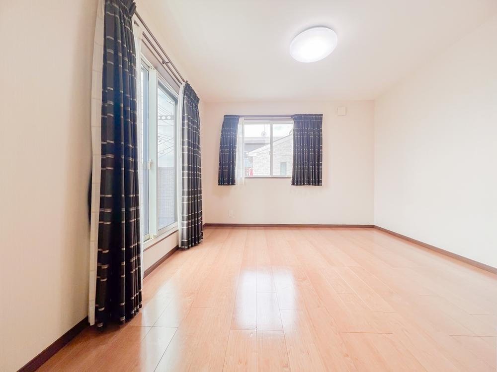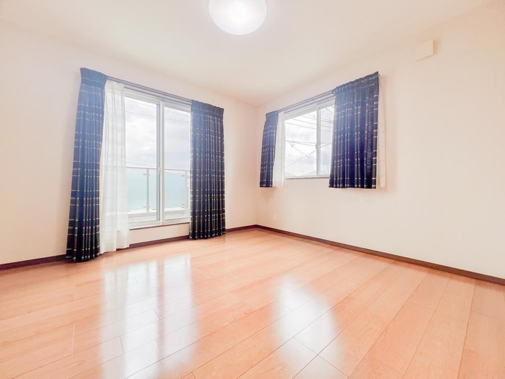 2階の洋室は南向きで日当たり良好です。大きな窓からは明るい日差しが差し込み、冬でも太陽の光でお部屋は暖かく過ごせます。 -