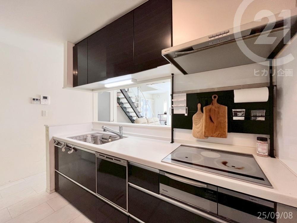 キッチンは人気の対面式!お料理をしながらでも、リビングの様子を見守ることができます。上部には吊戸棚もあり収納力が高いです。