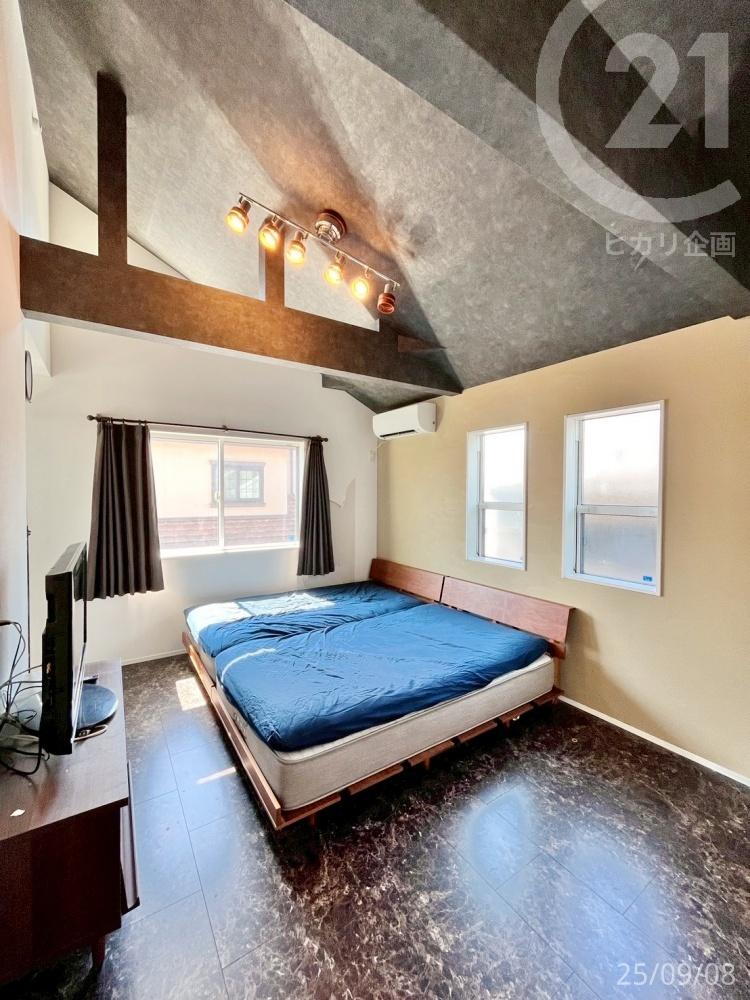 <洋室・9帖>2階には洋室が3室あり、全室5帖以上の広さが確保されています。こちらは広さは約9帖あり、主寝室におすすめ。化粧梁やアクセントクロスでオシャレな空間です。