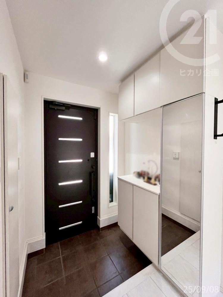 白を基調とした玄関で、空間を広く感じることができます。また、トールタイプのシューズボックスと壁面収納付きで、玄関もスッキリ!