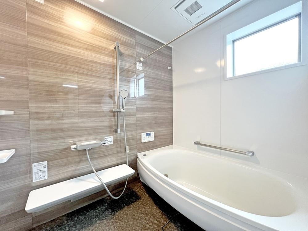 【令和4年築住宅】1.25坪サイズでゆったりしたバスルーム。木目調のアクセントパネルが映える上品!清潔感のある空間です。