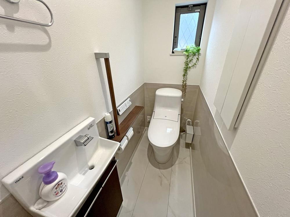 【令和4年築住宅】1階トイレは温水洗浄機能付き。壁収納を備え、使い勝手と清潔感を兼ねています。※家具・調度品は販売価格に含まれません