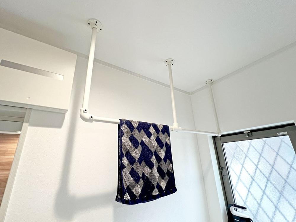 スタイリッシュなアイアンバーの室内物干しは耐荷重が大きく洗濯物をたっぷり干せる頼れる設備です。※家具・調度品は販売価格に含まれません