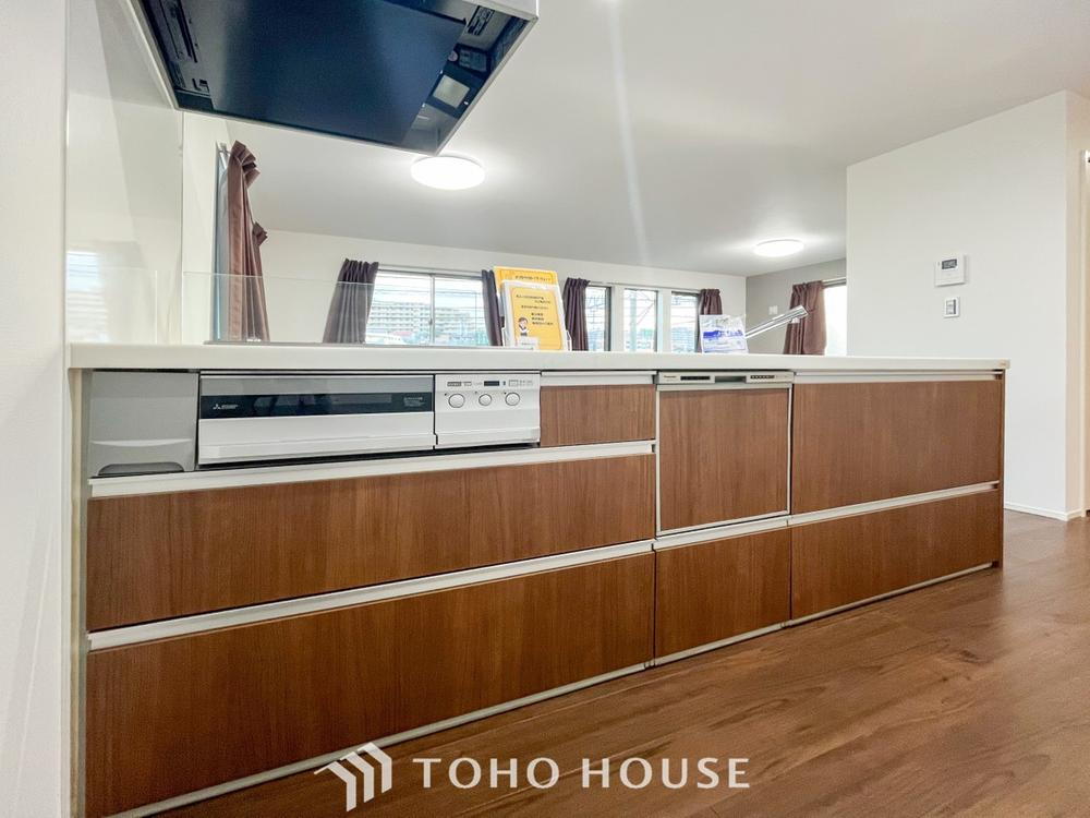 内装の主役でもあり、日常活躍する重要な水回りでもあるからこそ機能性・デザイン性に力を入れております。お手入れのしやすいシステムキッチンを採用しております。 -