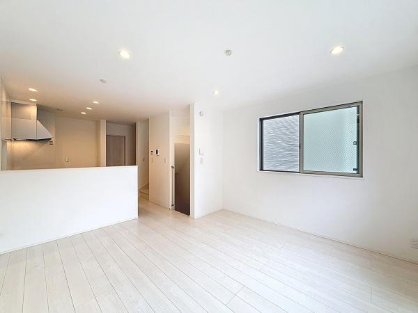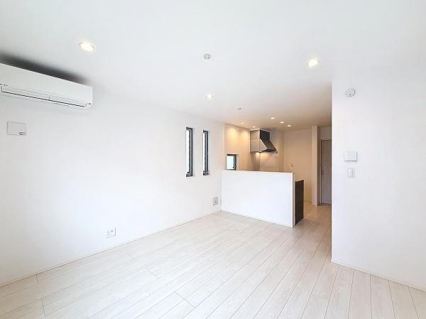 白を基調とした明るいリビングで暮らしやすさを感じられる空間です。キッチンとのつながりが良く動線がスムーズです。天井のダウンライトが落ち着いた雰囲気を演出します。エアコンも設置済みで快適に過ごせます。