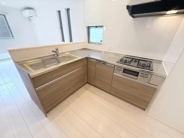 L字型のキッチンが使い勝手と動線の良さを演出しています。シンプルな木目調のデザインが空間に落ち着きを与えています。窓があるため明るさと開放感も感じられます。すっきりとした収納スペースも魅力の一つです。