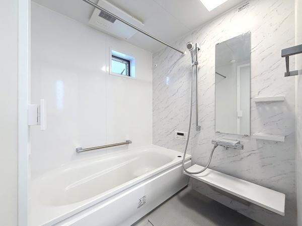 壁面のデザインが明るく清潔感のあるバスルームです。浴槽には手すりが設置されており安心して利用できます。ワイドな鏡と使いやすい棚が備わっています。窓もあり自然光が入ります。