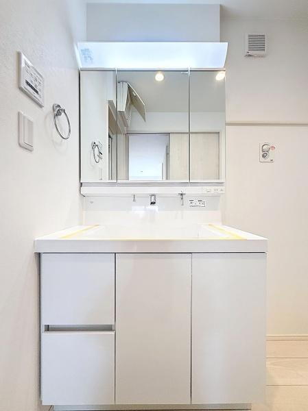 大きな三面鏡が配置された洗面台は収納スペースも充実しています。明るい照明が手元をしっかり照らします。シンプルなデザインが空間に調和しています。壁面には便利なリングホルダーも設置されています。