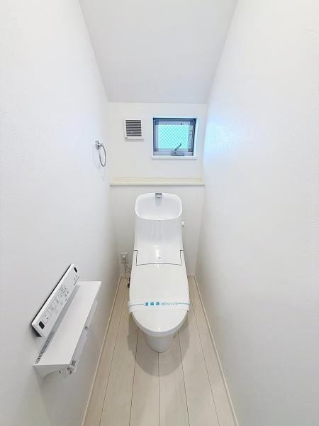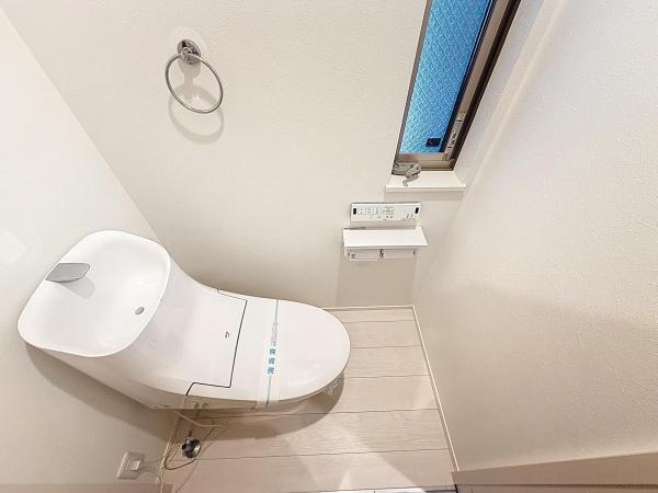 明るい印象のトイレ空間です。小窓付きで通風・採光が確保されています。スタイリッシュなデザインの設備が設置されています。壁や床も清潔感があります。