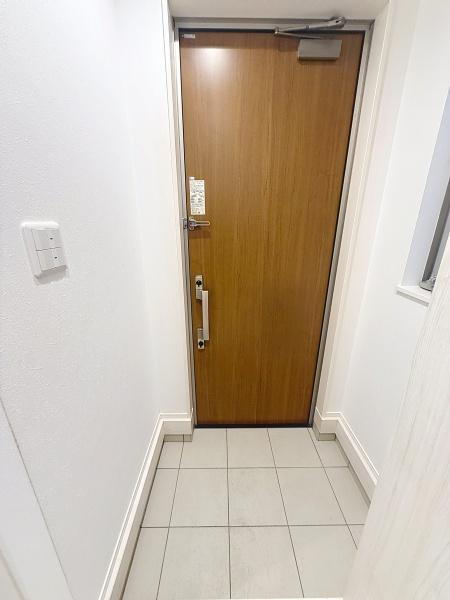 玄関はシンプルなデザインで清潔感が感じられます。床はタイル仕上げのためお手入れしやすいのが特長です。ドアには防犯性を高める設備が備わっています。無駄のないスペース設計で日常の使い勝手が良好です。