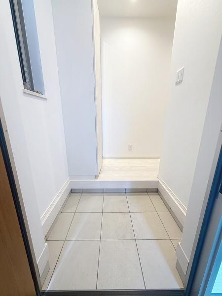 白を基調としたデザインで清潔感のある玄関です。広めのタイルスペースが足元をすっきりと見せてくれます。段差がしっかりとしており使い勝手にも配慮されています。明るい照明が空間全体を明るく照らしています。