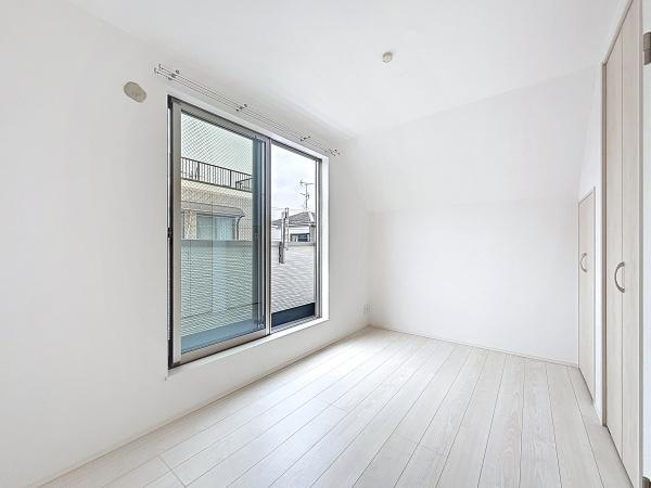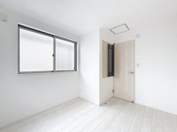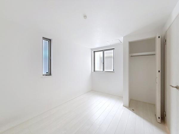 シンプルな内装で清潔感のある洋室です。収納スペースが二箇所あり使い勝手に配慮されています。明るい色の床材が空間の広がりを演出します。窓から自然光が取り込めます。