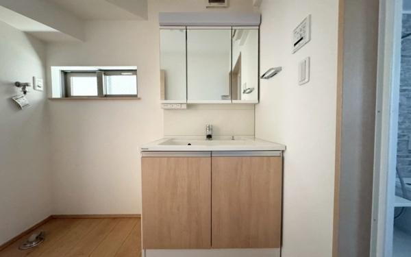 ゆとりの洗面スペースで朝の身支度も快適スムーズに!鏡の横に収納スペースがございますので、乱雑になりがちな洗面台まわりをすっきりご利用できます