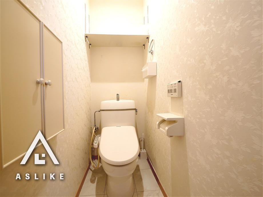 清潔感のあるアクセントが印象的なおトイレ。収納スペースも多めに用意されています